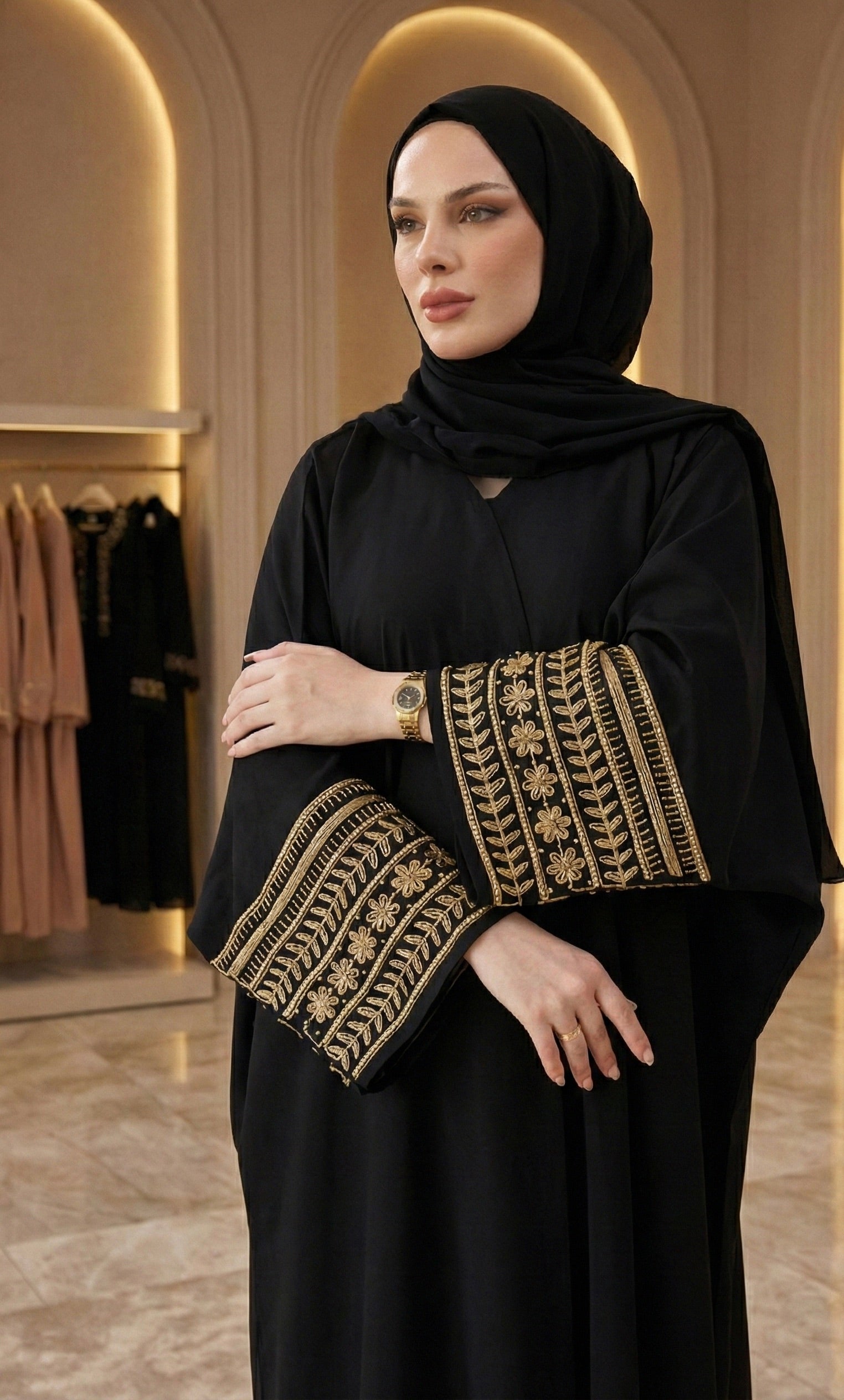 Styling Tip: Pair with a matching black hijab and gold accessories (like a watch or bracelet) to complement the intricate sleeve detailing.